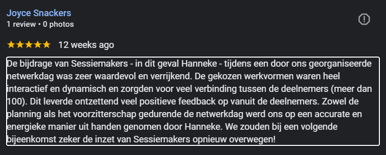 Weten hoe anderen onze trainingen, sessies en samenwerking hebben ervaren? Lees het in onze reviews op Google.